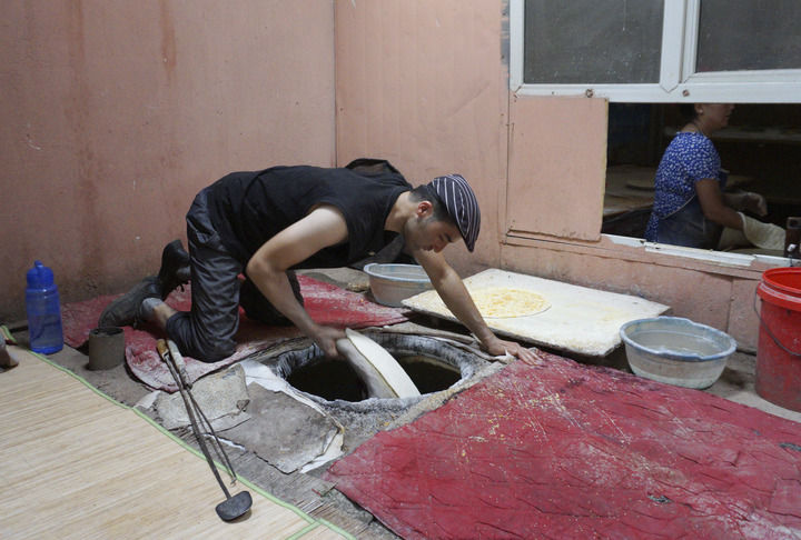 在新疆库车市,馕制作技艺国家级非遗代表性传承人热西提在自家馕店中打馕。王菲摄