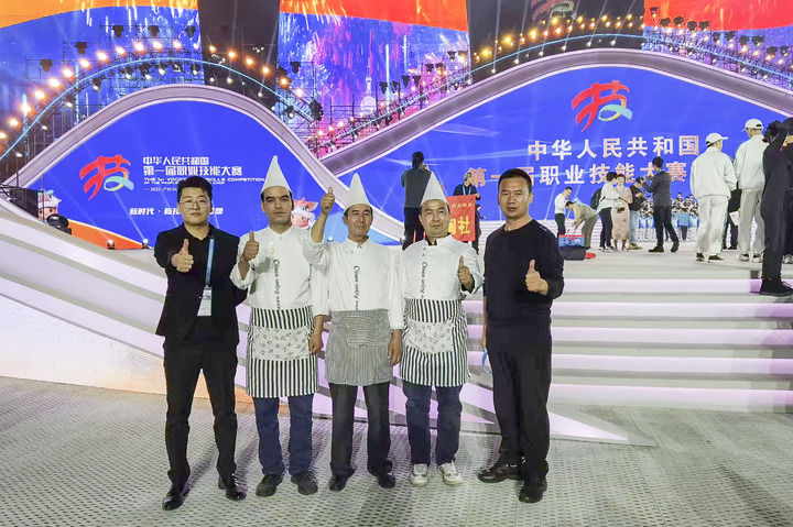 热西提(左三)作为展演嘉宾参加第一届全国技能大赛“中华绝技”现场展演后拍照留念(资料照片,库车市融媒体中心提供)。