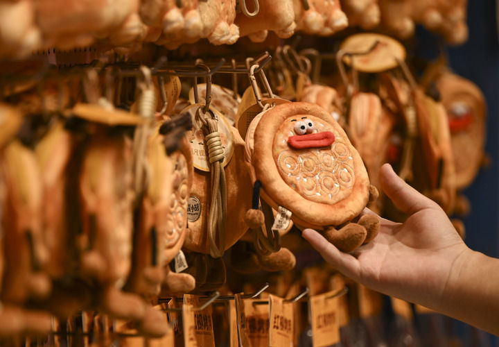 而多种多样的馕造型文创产品,在大巴扎步行街更是随处可见。远远看去,戴着维吾尔花帽的游客,背上背着一张圆圆的库车大馕,走近一瞧,原来是一个毛茸茸的背包。印着“有了窝窝馕,一年不窝囊”字样的窝窝馕造型抱枕让人忍不住想和它来张合影。“长”了眼睛和嘴巴的小馕冰箱贴、盲盒也透着俏皮可爱,游客纷纷抢购。