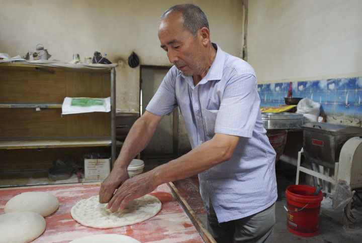 在新疆库车市,热西提在自家馕店中制作馕胚(7月22日摄)。新华社记者胥晓璇摄