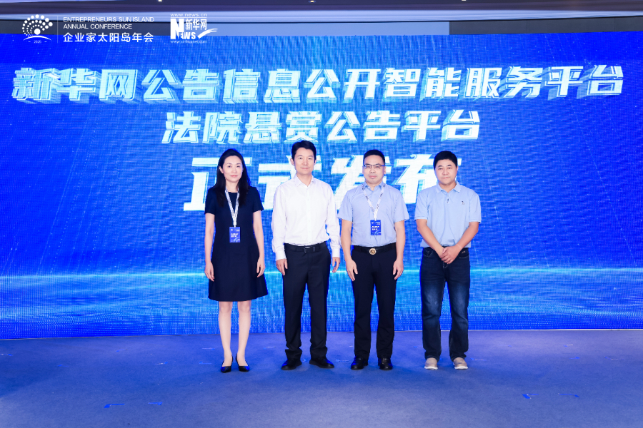 图为“新华网公告信息公开智能服务平台-法院悬赏公告平台”发布仪式。新华炫闻(北京)移动传媒科技有限公司执行董事、总经理胥斌(左二),亿达律师事务所高级合伙人陈锦龙(右二),大成律师事务所高级合伙人宋婉凝(左一),清华大学集成电路学院王光奇(右一)共同见证发布。新华网发