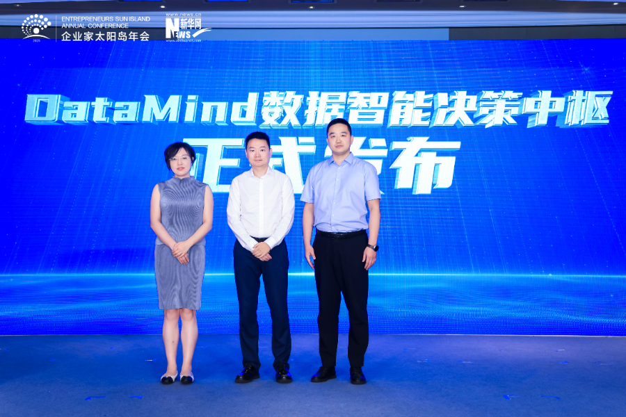 图为“DataMind数据智能决策中枢”发布仪式。中科闻歌副总经理武学敏(左一)、中绿讯科总经理孔飞(左二)、新华网数字经济事业中心总监李想(右一)共同发布。新华网发