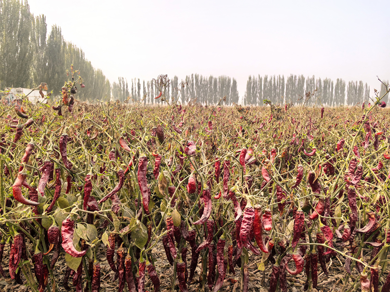 一师八团的辣椒地里,火红的辣椒挂满枝头。新华网发 李雨浪 摄