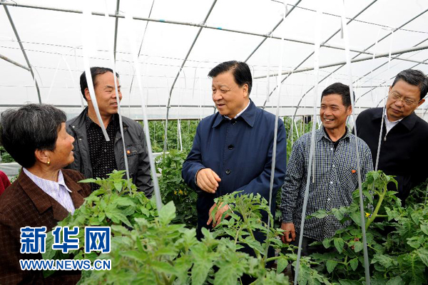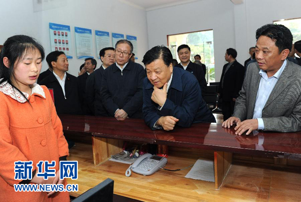 這是4月11日,劉云山在恩施六角亭街道辦事處頭道水村調(diào)研基層黨建。 新華社記者饒愛民攝