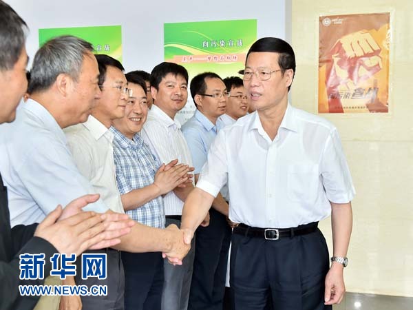 ??? 6月5日,中共中央政治局常委、國(guó)務(wù)院副總理張高麗到中國(guó)環(huán)境科學(xué)研究院和中國(guó)環(huán)境監(jiān)測(cè)總站調(diào)研。這是張高麗與科技工作者親切握手交談。新華社記者 李濤 攝