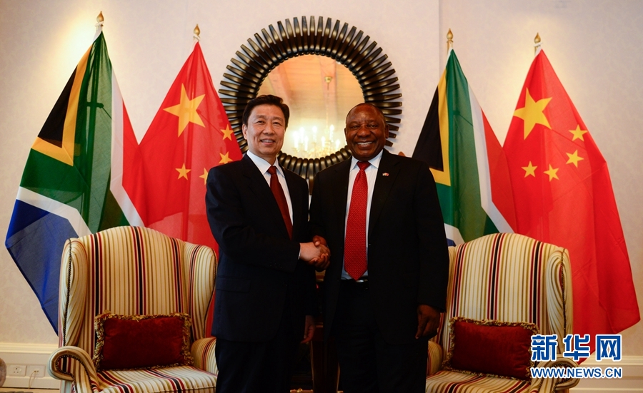 11月22日,在南非開普敦,中國國家副主席李源潮(左)與南非副總統拉馬福薩舉行會談。 新華社記者翟健嵐攝
