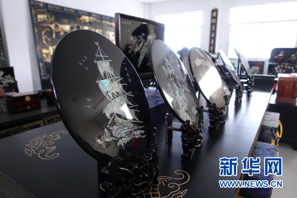 徽漆展廳里陳列的徽漆貝殼畫作品。新華網 卓越 攝