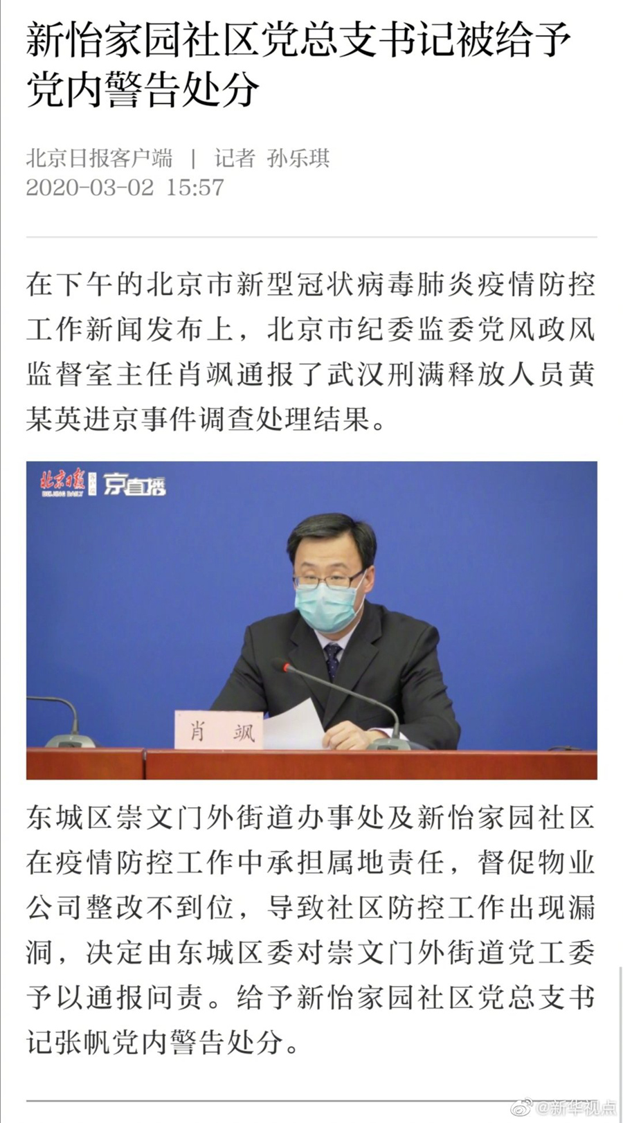 北京新怡家園社區黨總支書記被給予黨內警告處分-新華網