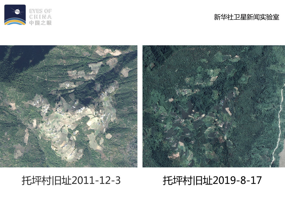 從衛星上看,托坪村舊址逐漸“消失”,與高黎貢山的綠色融為了一體。