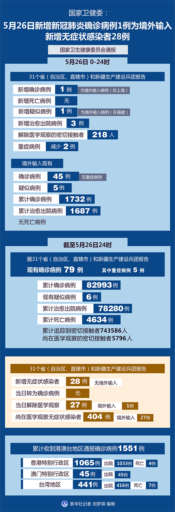 截至5月26日24時,據(jù)31個省(自治區(qū)、直轄市)和新疆生產(chǎn)建設兵團報告,現(xiàn)有確診病例79例(其中重癥病例5例),累計治愈出院病例78280例,累計死亡病例4634例,累計報告確診病例82993例,現(xiàn)有疑似病例6例。累計追蹤到密切接觸者743586人,尚在醫(yī)學觀察的密切接觸者5796人。