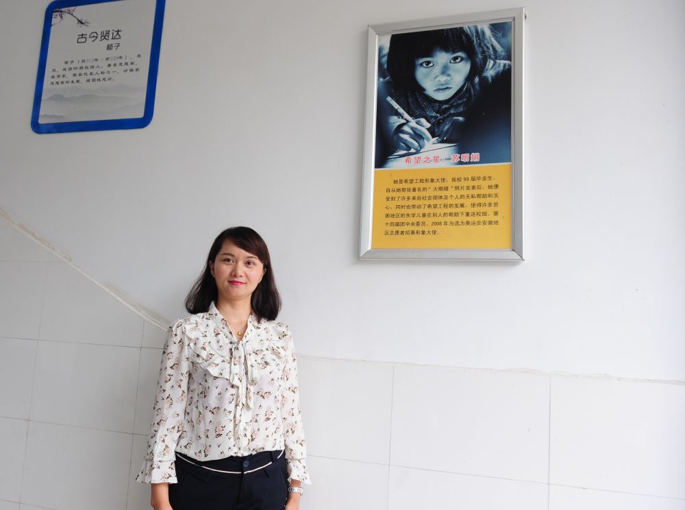 ↑2018年5月29日,在安徽金寨三合實驗學校,蘇明娟與當年的宣傳照片合影。