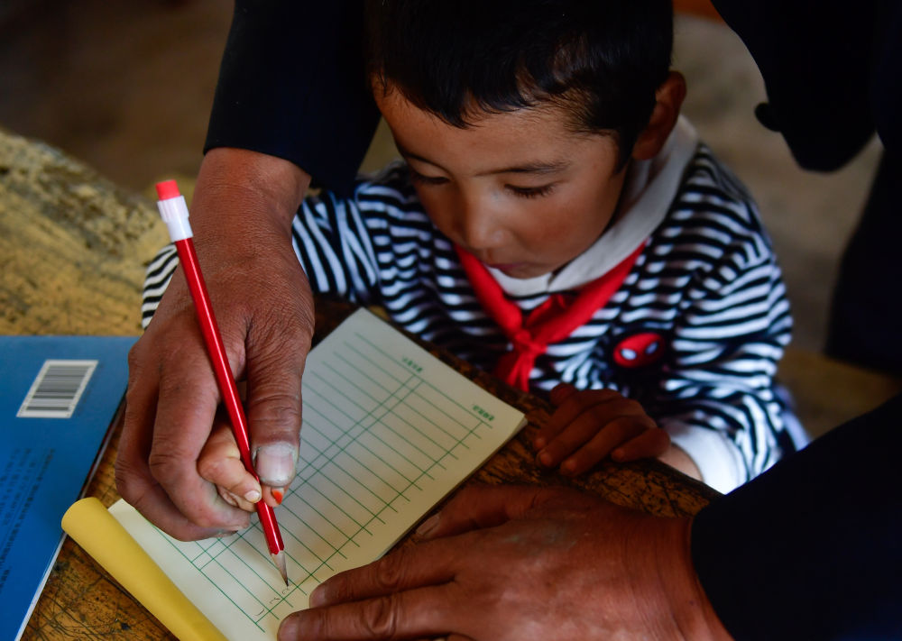 ↑ 2020年8月31日,在青海省海東市循化撒拉族自治縣白莊鎮來塘村學校,完么仁增老師在指導一年級學生馬文輝學習。