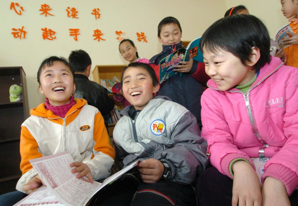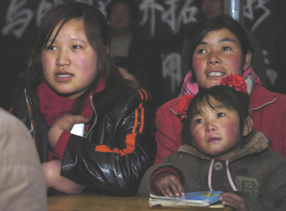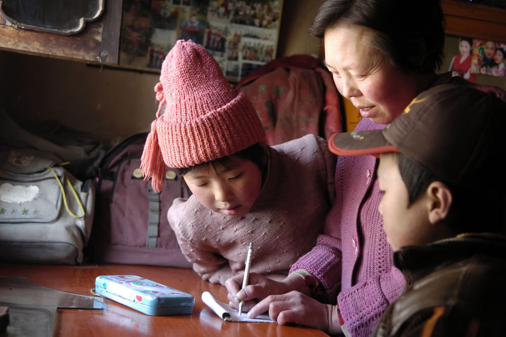↑ 2006年1月14日,甘肅漳縣三岔鎮朱家莊村沒上過學的40歲村民賈冬秀在她兩個上小學的孩子幫助下學習寫字。
