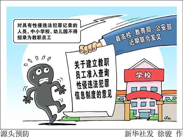 新華社北京9月18日電(記者陳菲)為加強對性侵未成年人犯罪的源頭預防,最高檢、教育部、公安部近期聯合發文,要求在全國建立入職查詢制度,對具有性侵違法犯罪記錄的人員,中小學校、幼兒園不得錄用,教師認定機構不得認定教師資格。