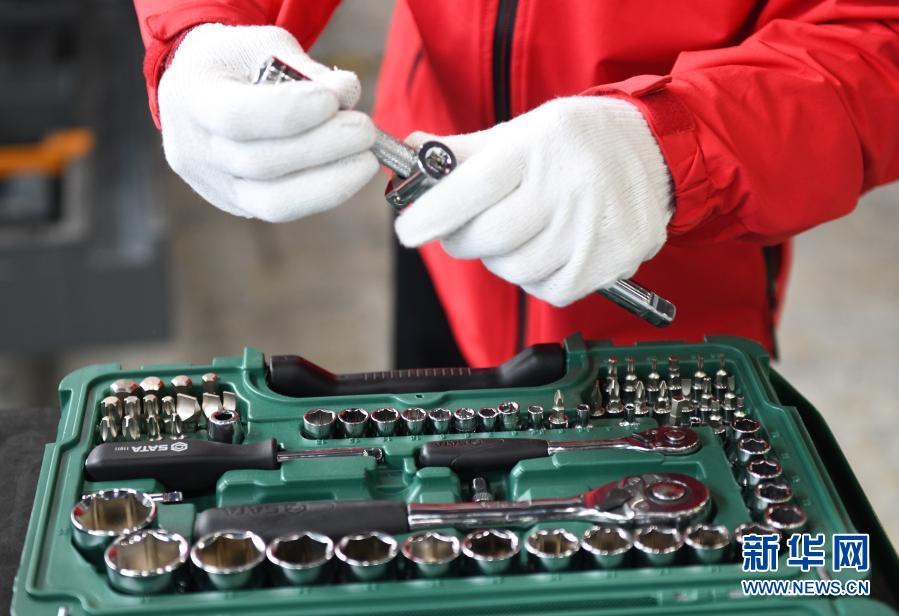 選手在汽車(chē)車(chē)身修理項(xiàng)目比賽中挑選工具(12月11日攝)。新華社記者 盧漢欣 攝