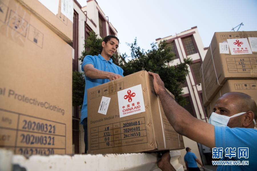 2020年5月10日,在埃及首都開羅,工作人員搬運(yùn)中國(guó)政府援助的抗疫物資。新華社記者 鄔惠我 攝