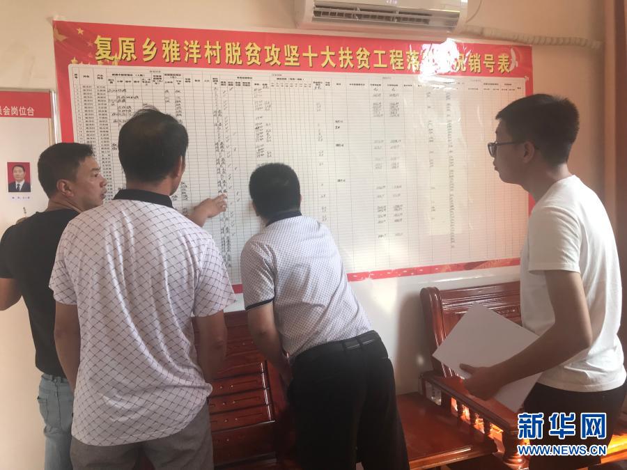 吳應(yīng)譜(右一)在雅洋村和同事研究扶貧工程落實(shí)情況(資料圖片)。新華社發(fā)(修水縣委宣傳部供圖)