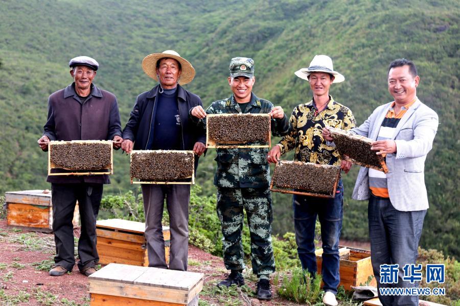 武警四川總隊涼山支隊精準幫扶昭覺縣梭梭拉打村發展養蜂產業,總隊駐村扶貧干部布哈(中)和村民一同展示豐收成果(2019年6月12日攝)。新華社發(楊劍 攝)
