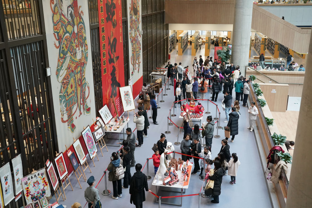2025年1月1日,观众在位于西安的陕西省图书馆高新馆区内参观一场非遗文化展览。西安市持续推出各类主题和形式的公共文化活动,为市民、游客提供丰富的精神文化生活。