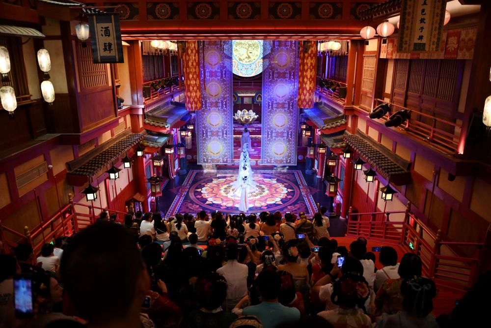 2024年5月12日,游客在西安长安十二时辰主题街区内观看演出。街区通过汉服旅拍、演艺互动、非遗体验等项目,让游客“穿越”回盛唐长安,为游客打造科技感、文化味十足的游历体验。