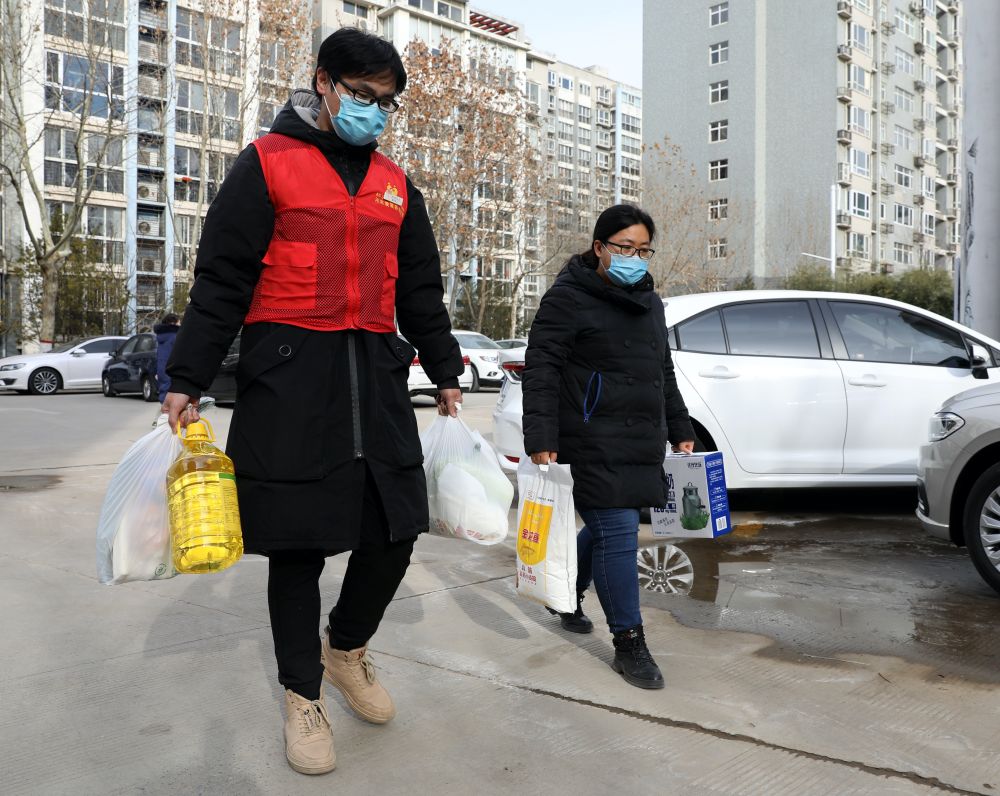 ↑1月10日,在雅清苑社區,志愿者(左)幫助居民配送生活物資。