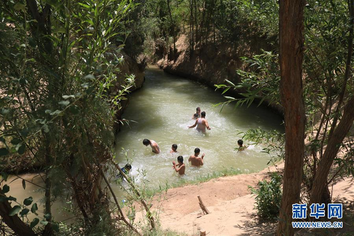 7月19日,在阿富汗北部朱茲詹省希比爾甘,當地兒童在水中游泳納涼。新華社發 穆罕默德·詹·阿里亞 攝