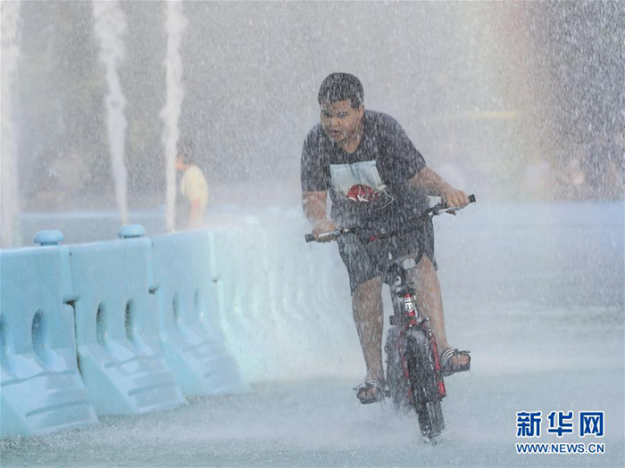 7月9日,在美國紐約,一名兒童在科羅納公園的噴泉戲水。 夏季來臨,紐約的噴泉、水池吸引許多民眾戲水消暑。 新華社記者 王迎 攝