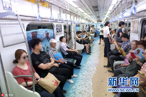 地下交通也得講究涼快。韓國釜山地鐵就曾設置了“海灘地鐵”車廂,將沙灘和波浪的美景帶進車廂,為炎炎夏日中乘坐地鐵的乘客帶來一絲清涼。