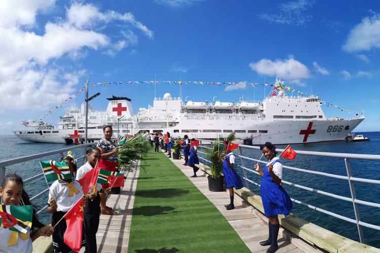 2018年10月12日,在多米尼克首都羅索,當?shù)貙W生揮動多中兩國國旗歡迎中國海軍和平方舟醫(yī)院船首次到訪。(新華社發(fā))