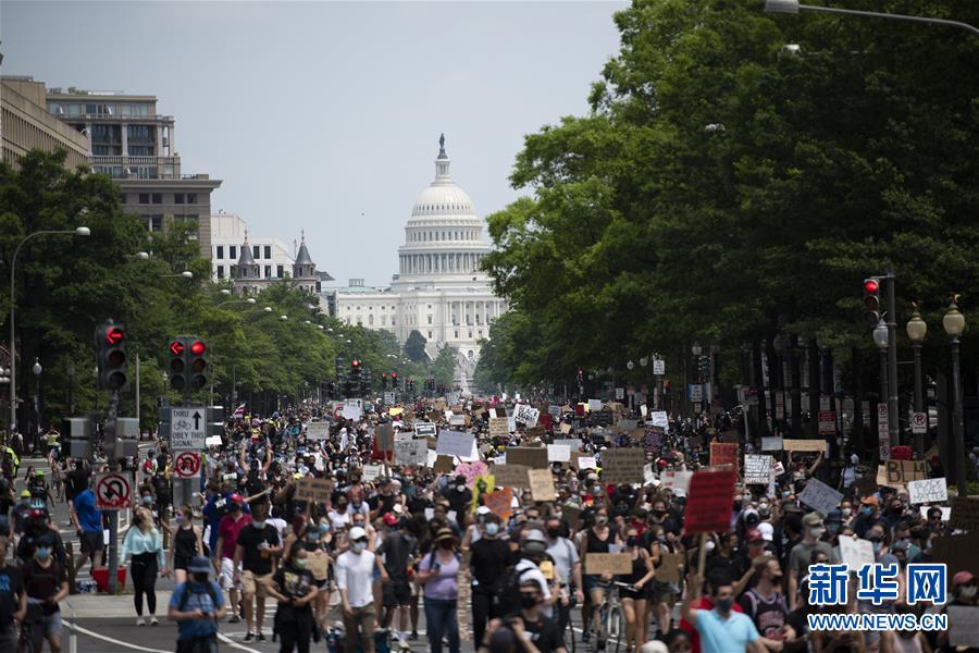 6月6日,人們在美國華盛頓國會附近游行。美國首都迎來了十幾天來參與人數最多的游行活動。新華社記者 劉杰 攝