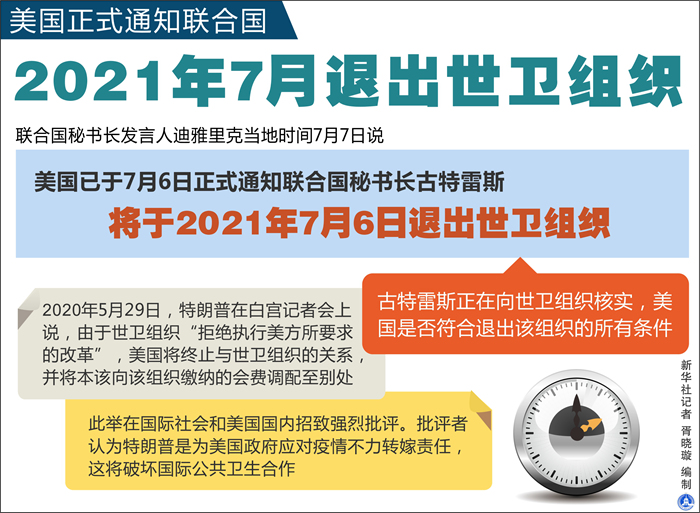 迪雅里克當(dāng)天通過(guò)郵件向媒體證實(shí),美國(guó)已于6日正式通知古特雷斯,將于2021年7月6日退出世衛(wèi)組織。古特雷斯正在向世衛(wèi)組織核實(shí),美國(guó)是否符合退出該組織的所有條件。