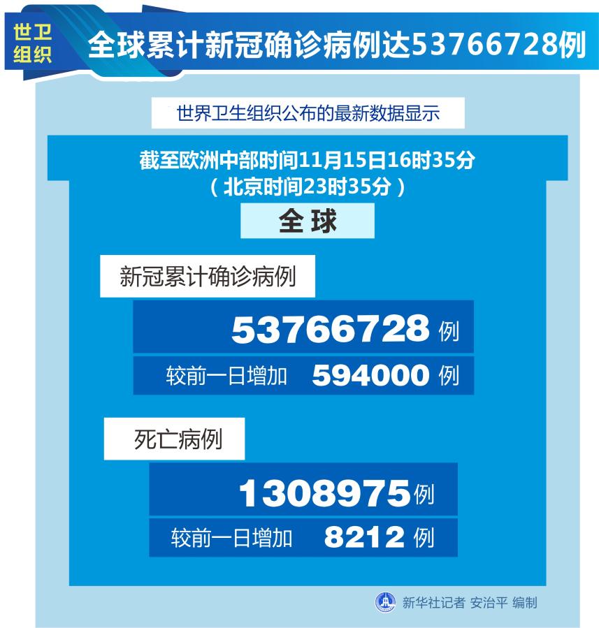 新華社日內(nèi)瓦11月15日電(記者劉曲)世界衛(wèi)生組織15日公布的最新數(shù)據(jù)顯示,全球累計(jì)新冠確診病例達(dá)53766728例。