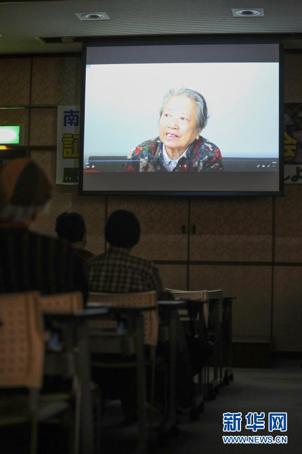 12月13日,人們在日本東京舉行的紀念南京大屠殺83周年集會現場觀看南京大屠殺幸存者石秀英的講述紀錄片。新華社記者 杜瀟逸 攝