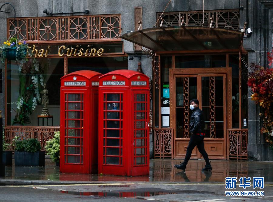 12月21日,一名戴口罩的男子經過英國倫敦特拉法加廣場旁一家關閉的餐廳。新華社記者 韓巖 攝