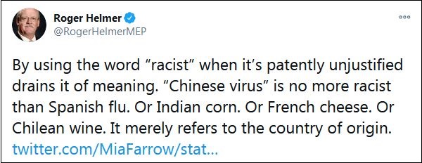 大量網(wǎng)友在他的這條推特下,挖出赫爾默曾經(jīng)發(fā)表的言論。例如早在3月17日,赫爾默就在一條推特中宣稱:“在明顯不合理的情況下,使用‘種族主義’這個(gè)詞會(huì)讓它失去意義。‘中國(guó)病毒’和‘西班牙流感’一樣不是種族主義。就像印度玉米,或法國(guó)奶酪,或者智利葡萄酒。它僅僅是指原產(chǎn)國(guó)。”