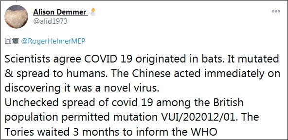 還有一名網(wǎng)友對(duì)比稱:“科學(xué)家同意新冠病毒起源自蝙蝠,變異后傳播給人類,中國(guó)人發(fā)現(xiàn)這是一種新病毒后,立即采取了行動(dòng)。新冠病毒在英國(guó)人口中無(wú)限制的傳播,導(dǎo)致了變異新冠病毒(VUI/202012/01),保守黨等了3個(gè)月才通知世衛(wèi)組織。”