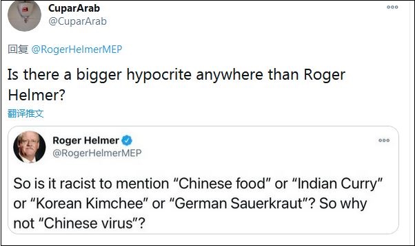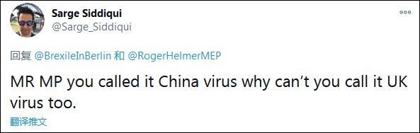 不少網(wǎng)友指出了赫爾默的雙標(biāo)。“議員先生,你管這(新冠病毒)叫‘中國(guó)病毒’,為什么不也把它叫做英國(guó)病毒?”
