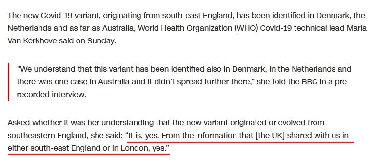 12月20日,世衛(wèi)組織緊急項(xiàng)目技術(shù)主管瑪麗亞·范·克爾科夫(Maria Van Kerkhove)曾在采訪中被問(wèn)及變異病毒是否起源或在英國(guó)東南部進(jìn)化的問(wèn)題,她回答說(shuō):“是的。從英國(guó)和我們分享的信息來(lái)看,要么是在英國(guó)東南部,要么是在倫敦。是的。”