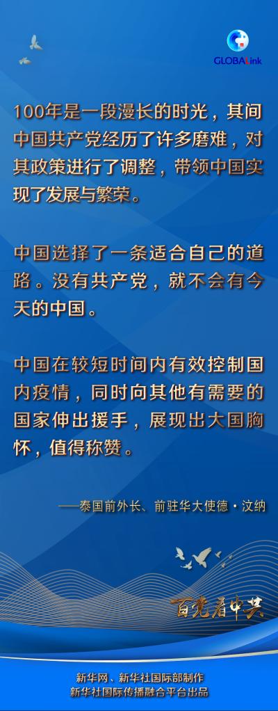 新華社曼谷5月29日電 “100年是一段漫長(zhǎng)的時(shí)光,其間中國共產(chǎn)黨經(jīng)歷了許多磨難,對(duì)其政策進(jìn)行了調(diào)整,帶領(lǐng)中國實(shí)現(xiàn)了發(fā)展與繁榮。”泰國前外長(zhǎng)、前駐華大使德·汶納日前在曼谷接受新華社專訪時(shí)說。