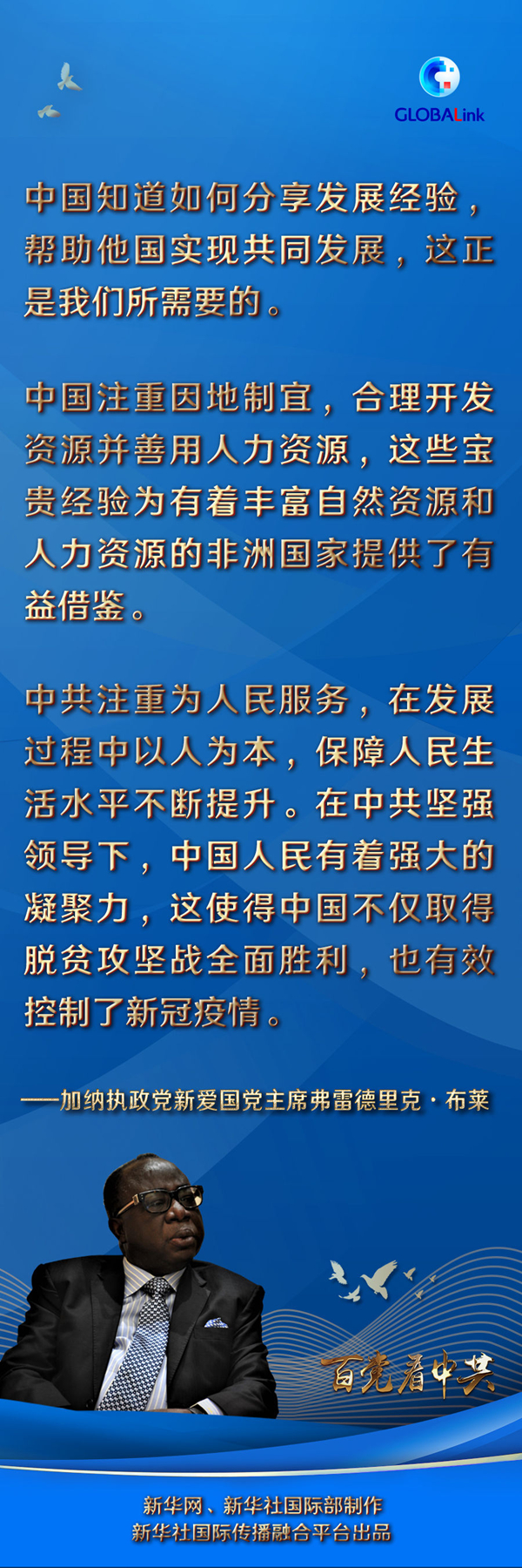 新華社阿克拉6月6日電 “中國是一個樂于分享發展經驗的國家?!奔蛹{執政黨新愛國黨主席弗雷德里克·布萊日前在阿克拉接受新華社記者專訪時說,中國共產黨領導世界上人口最多的國家取得脫貧攻堅戰全面勝利,體現出卓越的領導力。