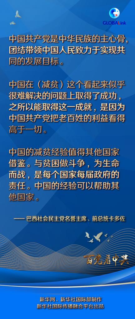 卡多佐說,他曾幾次訪問中國,中國的發展給他留下了深刻印象。他稱贊中國共產黨領導下的中國在減少貧困方面取得巨大成就。